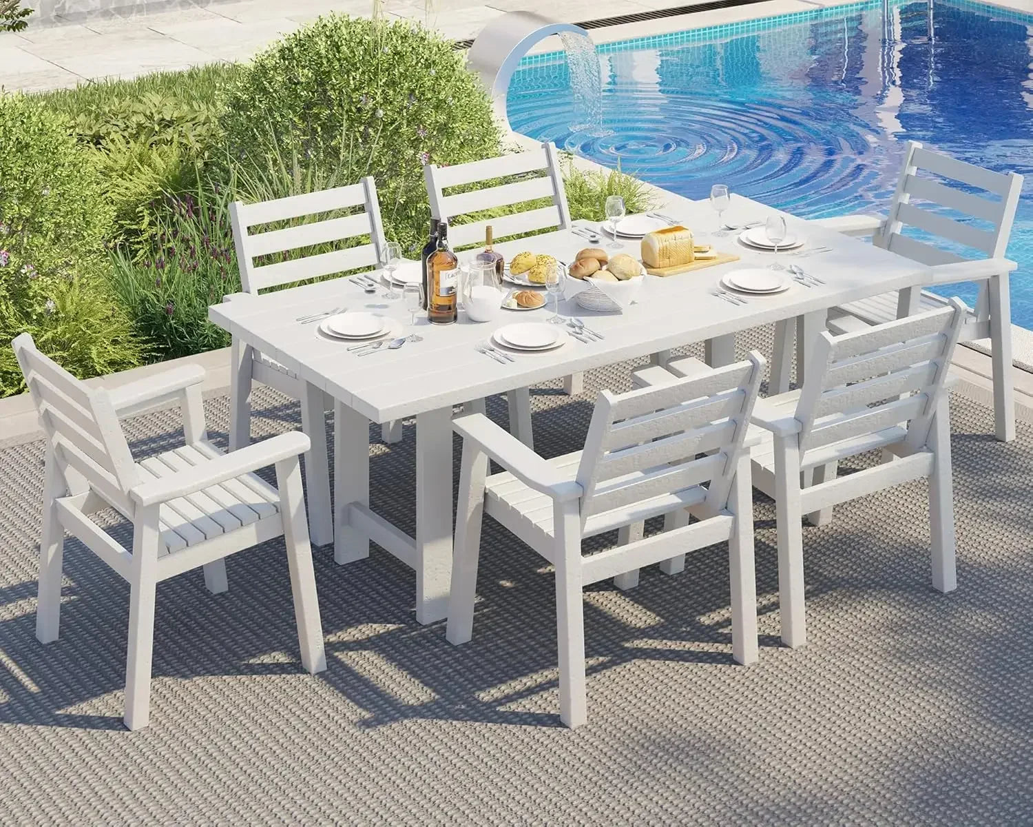 7 Piece HDPE Outdoor Dining Table Set with 6 Chairs 71 Inch Patio Dining Furniture Set with Umbrella Hole