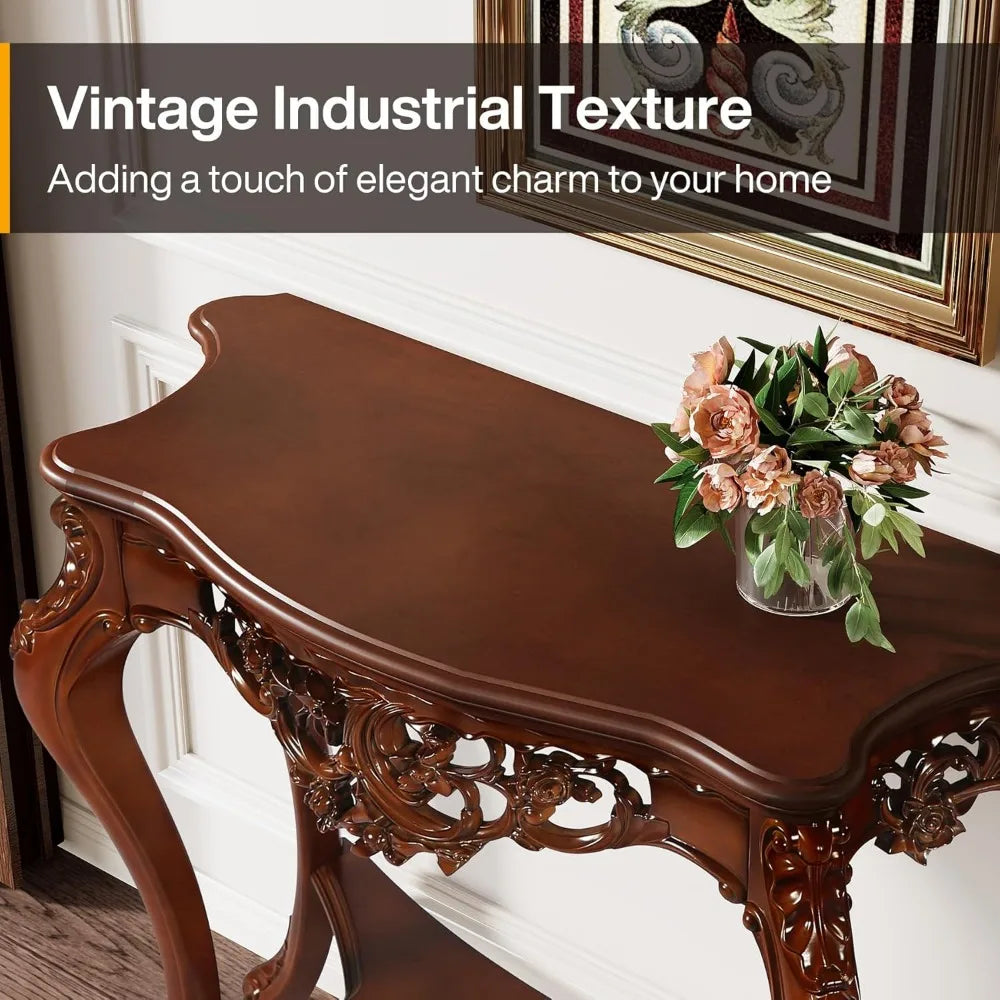 Elevate your living space with the Antique Console Table, a stunning 38-inch Victorian half moon sofa table that embodies vintage charm and traditional design. Crafted from high-quality engineered wood, this exquisite piece features a hollow floral apron and elegantly styled cabriole legs, making it a perfect addition to any traditional or vintage-inspired decor.