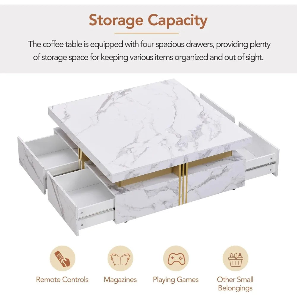 Modern Square Coffee Table with 4 Drawers Contemporary Luxury Center Table with Gold Accents