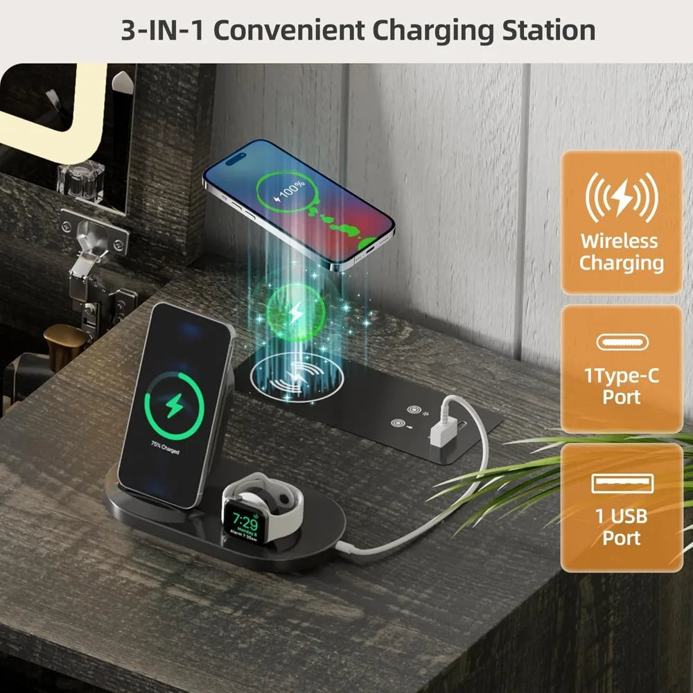 - Convenient Charging Station: Equipped with a wireless charging station and USB & Type-C ports, you can effortlessly charge your devices while you get ready.