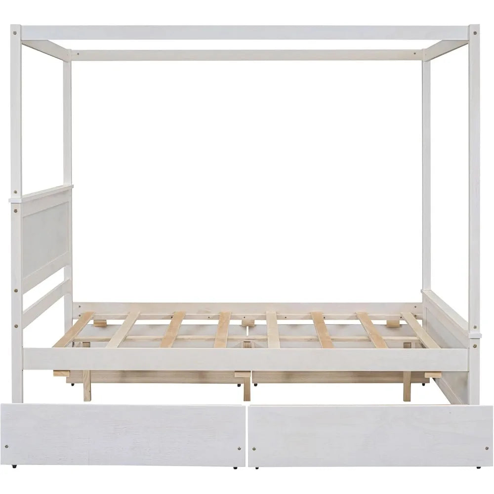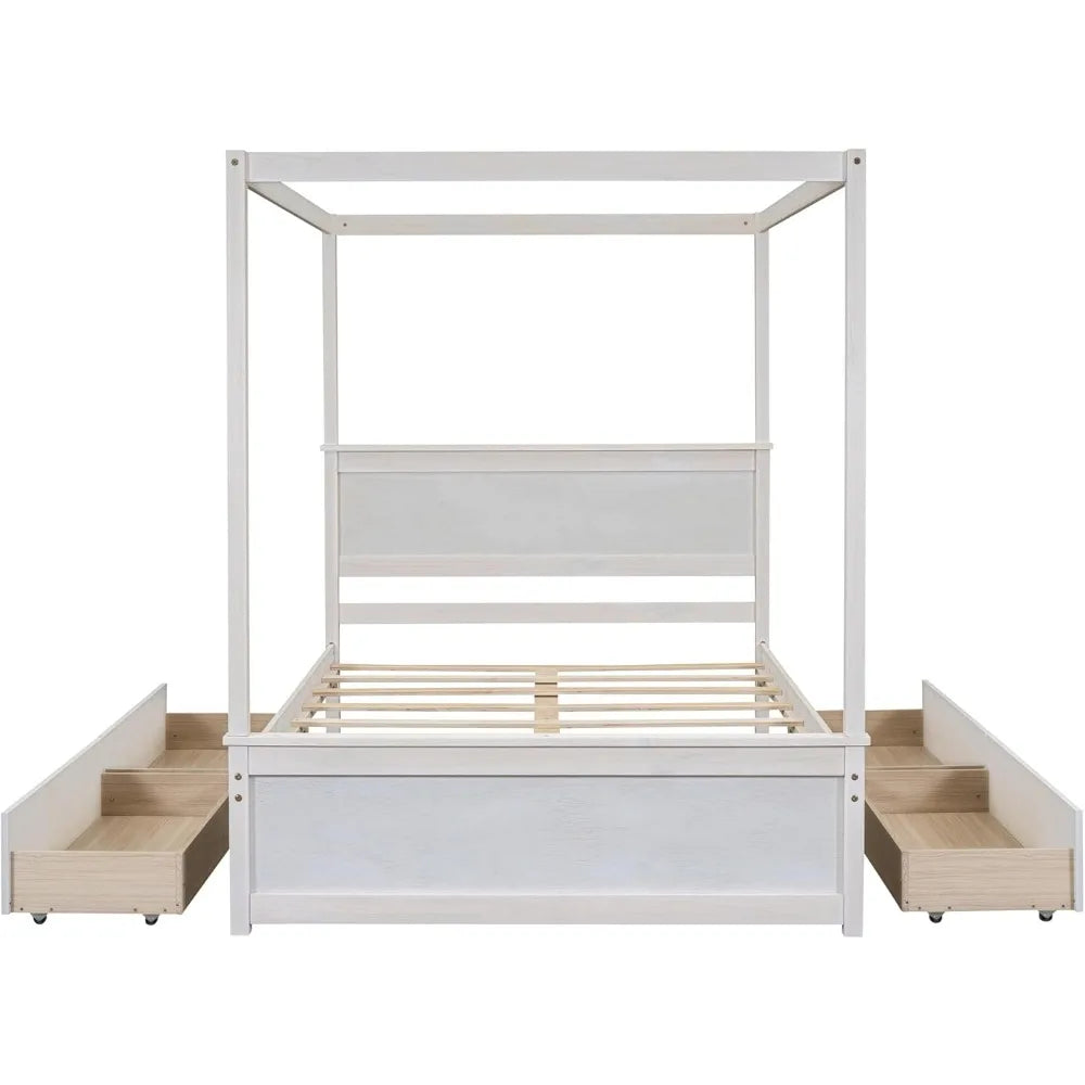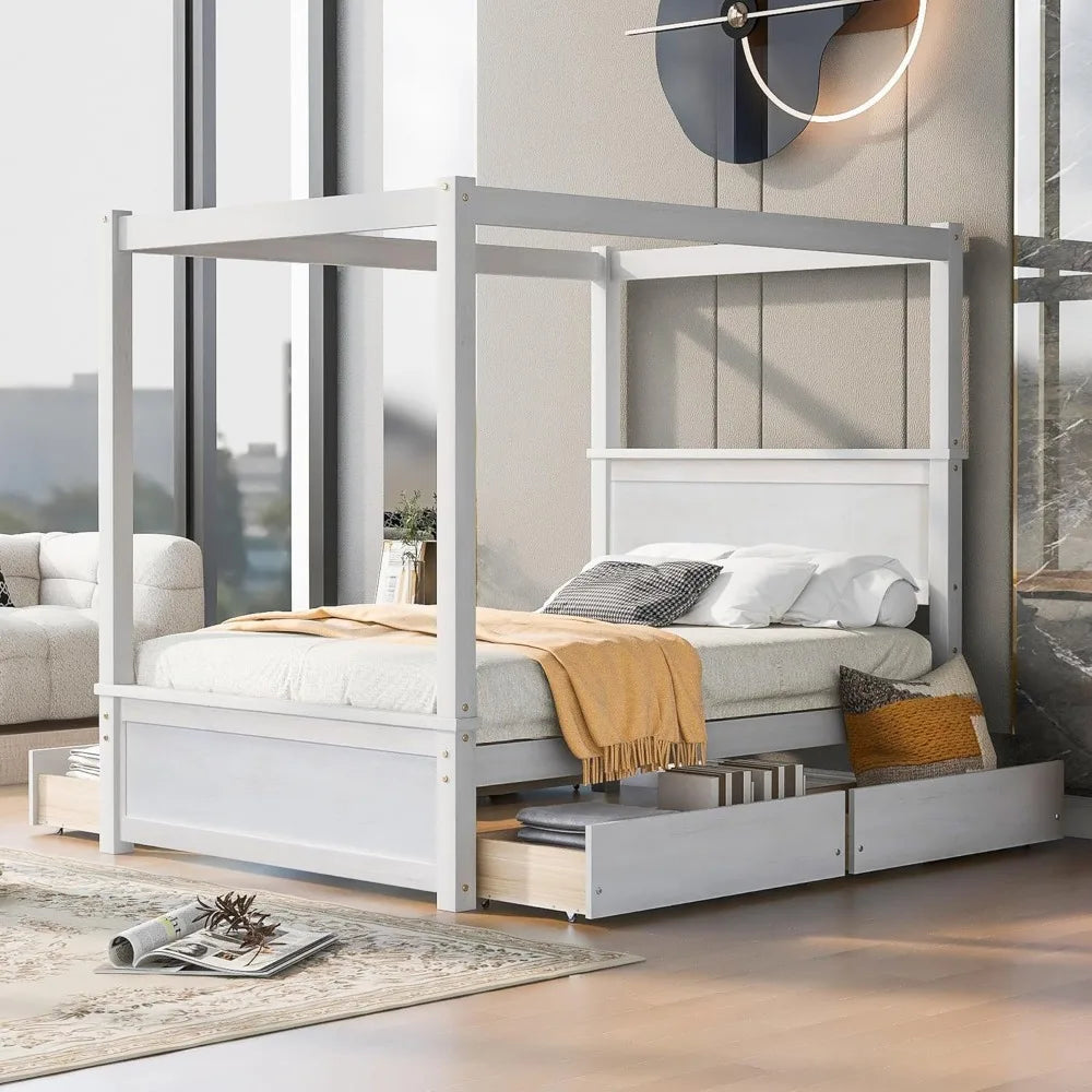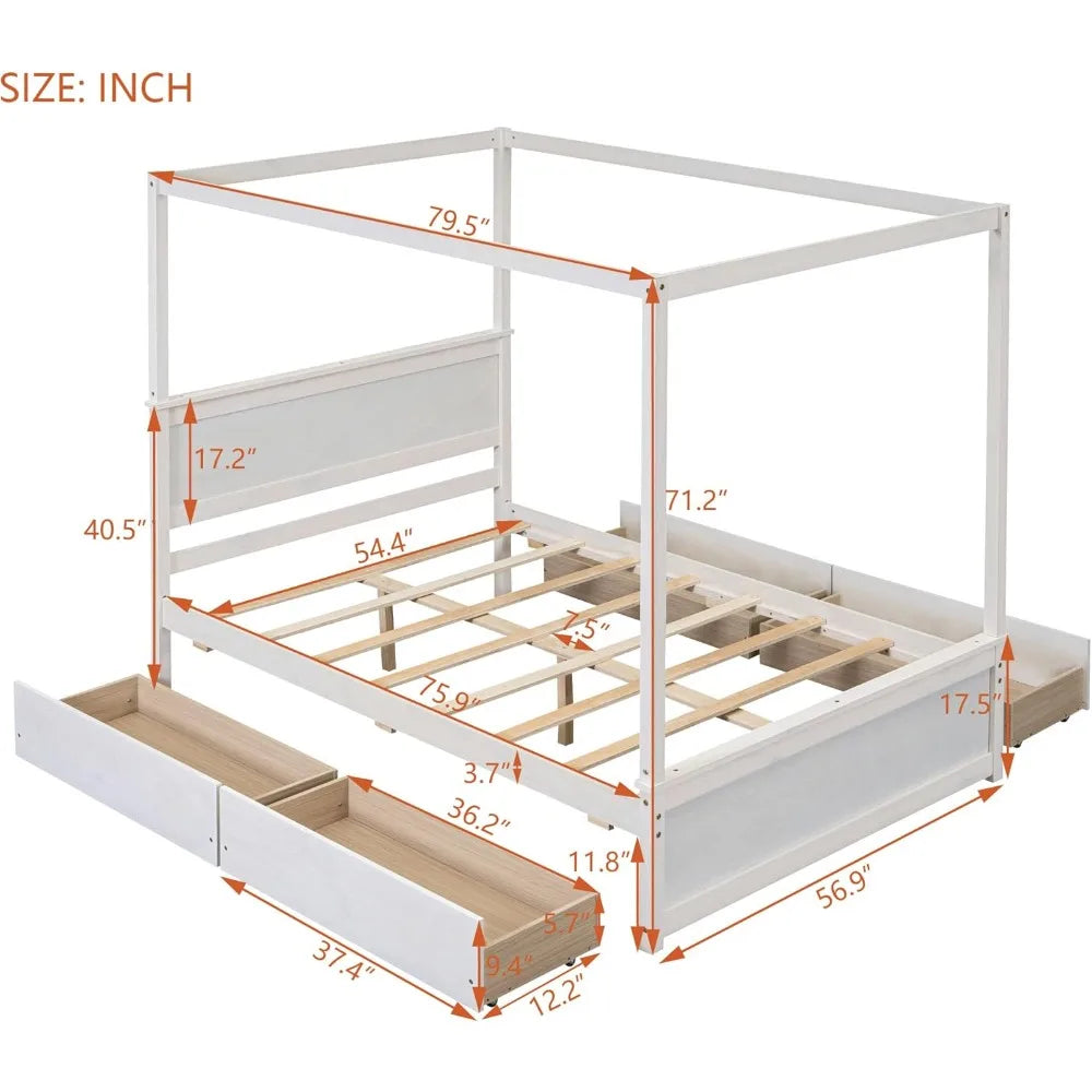 Full Canopy Bed with 4 Drawers, Four-Poster Platform Bed with Headboard and Wood Support Slats, Full Bed Frame Wood Poster Panel