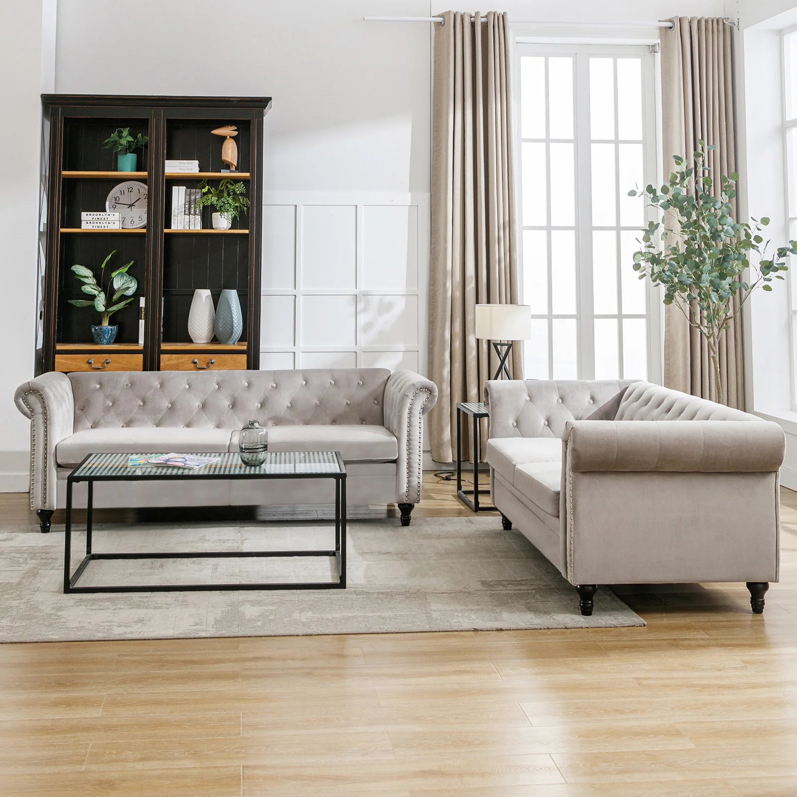 Horgaeo Button Upholstered Velvet Sofa Classic Chesterfield Tufted Camel Back Furniture Set