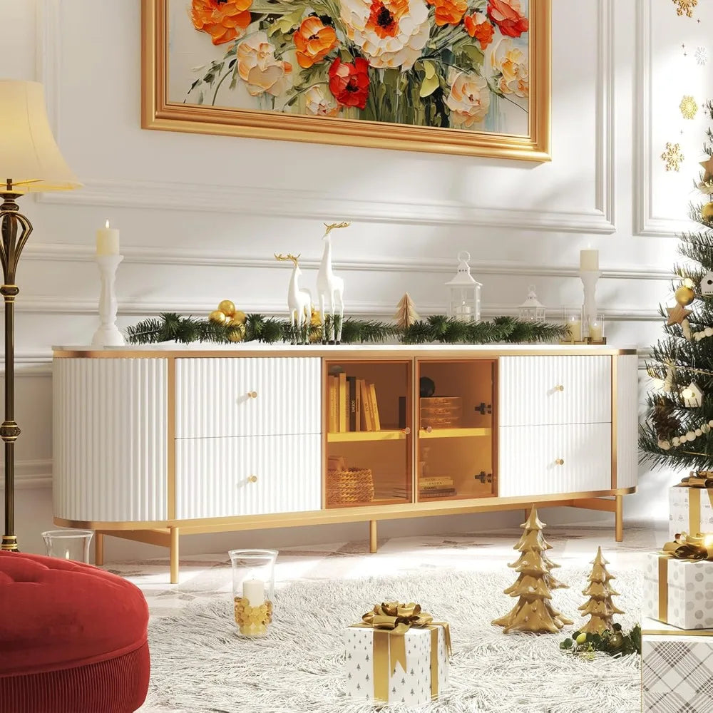 Luxury 70 Inch Fluted TV Stand for TVs Up to 75 Inches Modern Entertainment Center with Faux Marble Top Media Console with Curved Glass Doors