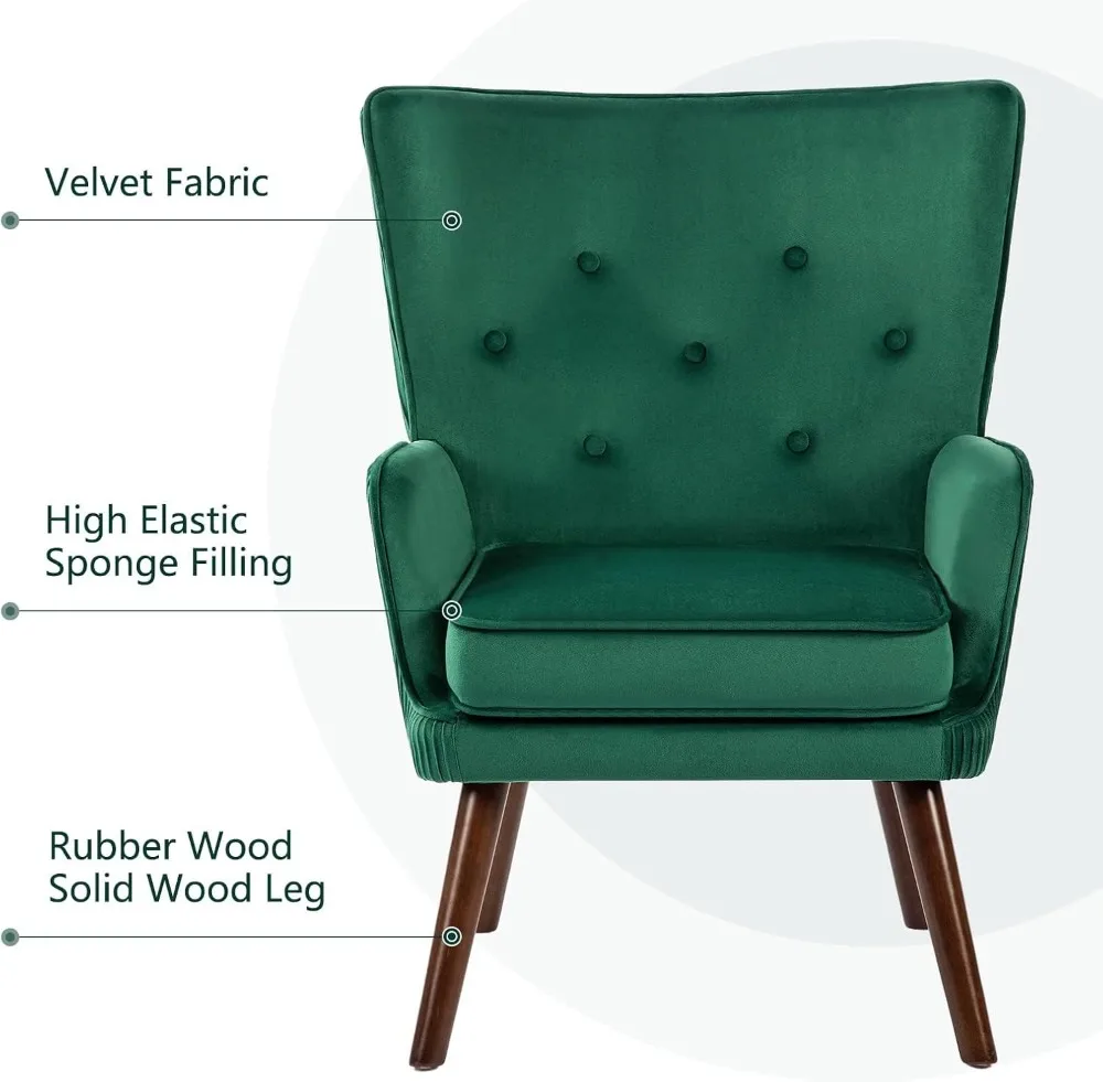 - 【Premium Fabric & Unique Design】: Made of 290gsm velvet fabric, this green velvet upholstered chair boasts a lustrous finish and a tightly woven texture that's both pet and family-friendly. Its beautiful color and retro button tufting on the backrest and uniform vertical stripes on back make for a unique and elegant appearance. Upgrade your living space with this luxurious and comfortable arm chair.