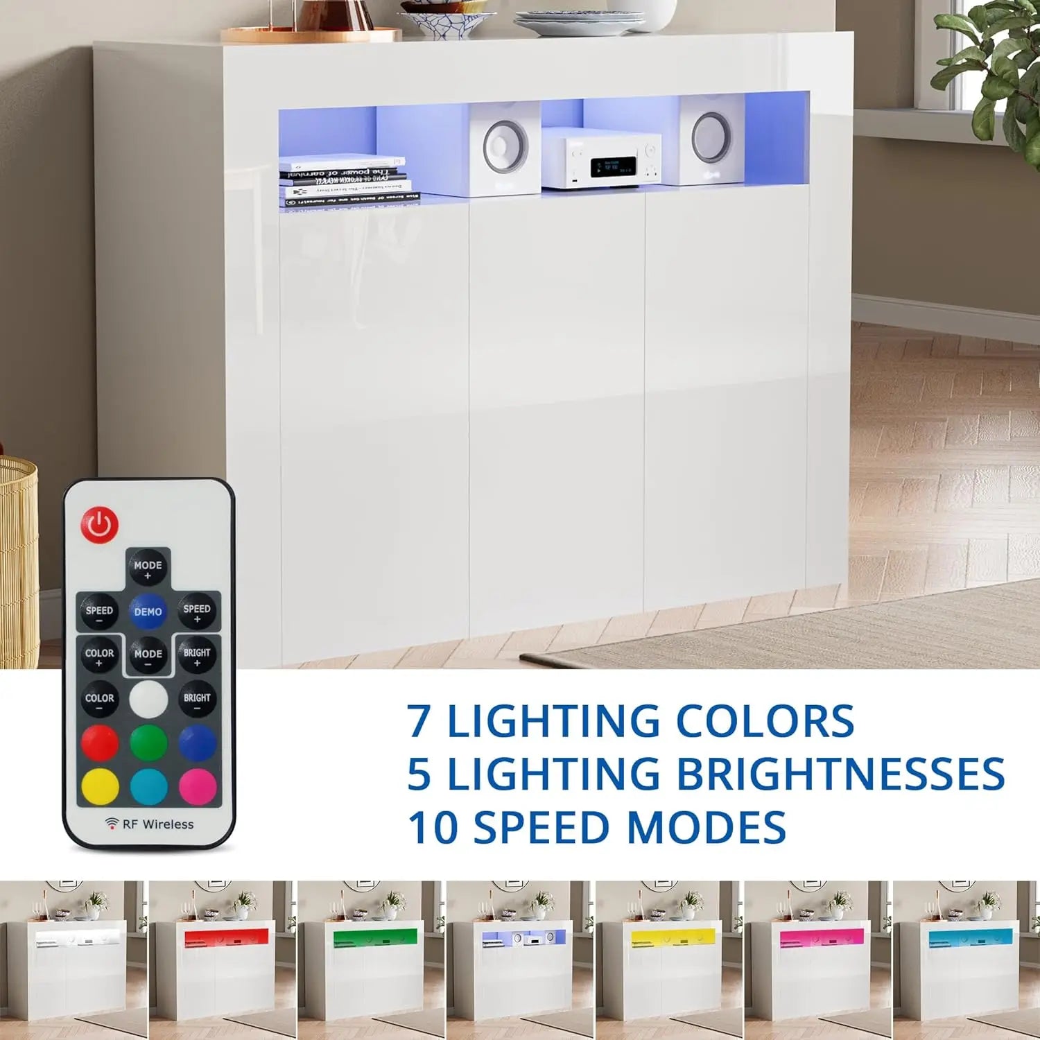 Modern White Buffet Cabinet with LED Lights High Gloss Sideboard Storage Cabinet with 3 Doors and Adjustable Shelf
