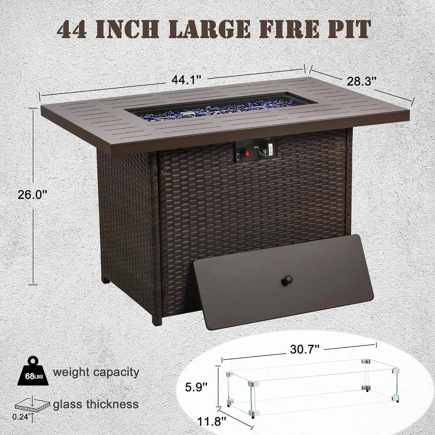 Propane Fire Pit Table 44 Inch 55000 BTU Outdoor Gas Fire Pit Rectangular with Glass Wind Guard Brown Aluminum Top