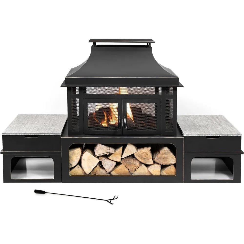 Rimasco 80 Inch Metal Wood Burner Fireplace with Side Storage Tables Smokeless Patio Fire Pit