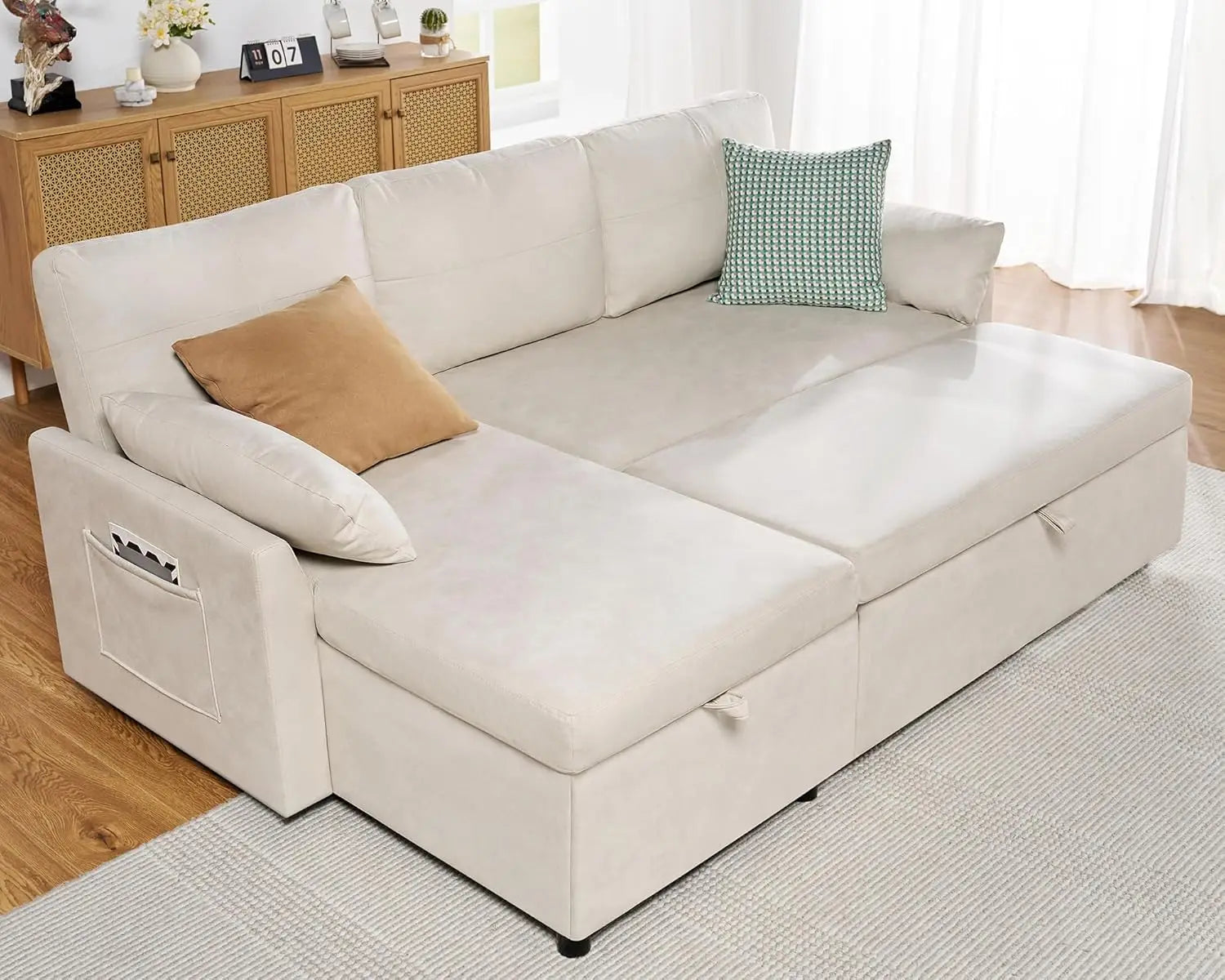 Sofa Bed, Sofa Sleeper with Chaise, Pull Out Couch for Living Room, Off-White Leathaire,