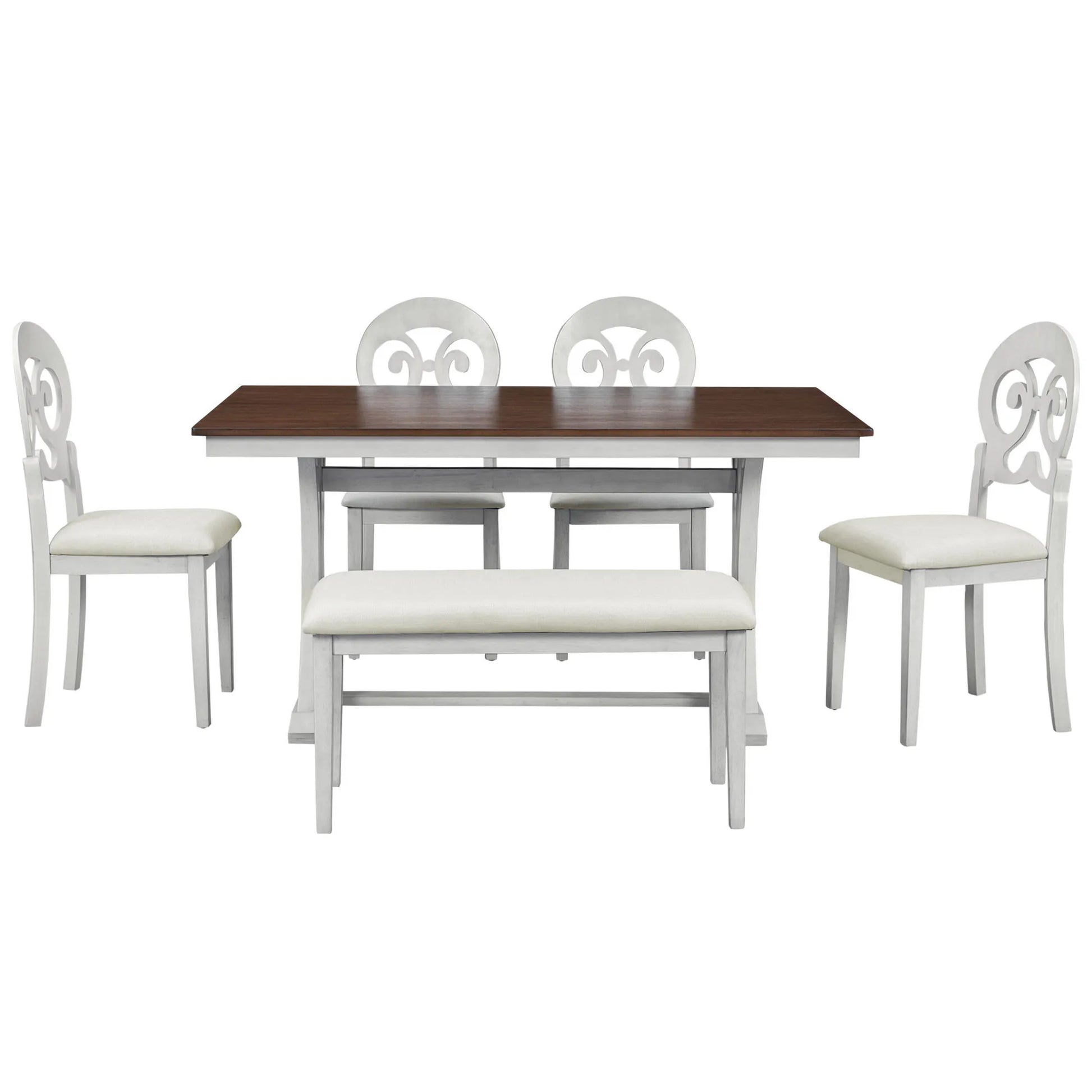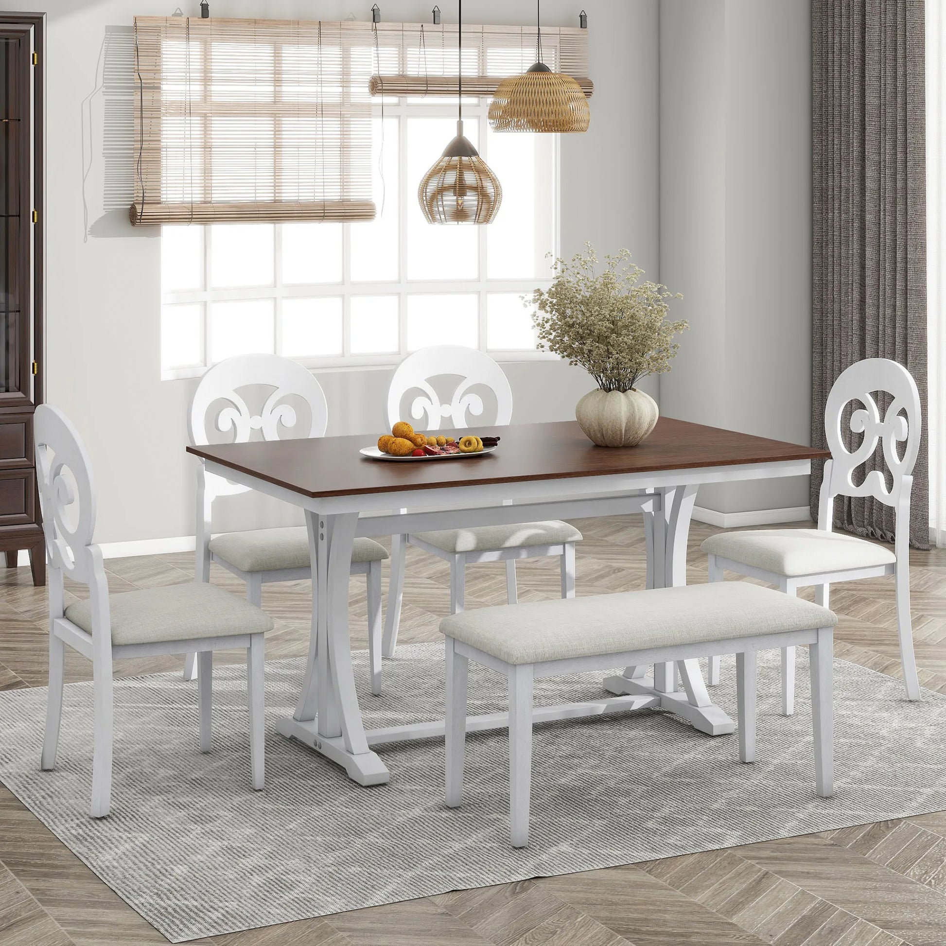 Introduce a touch of elegance and sophistication to your dining area with the TOPMAX Mid-Century 6-Piece Trestle Table Set. This stunning set features a beautifully crafted rectangular trestle table, complemented by four Victorian round upholstered dining chairs and a gracefully designed long bench.