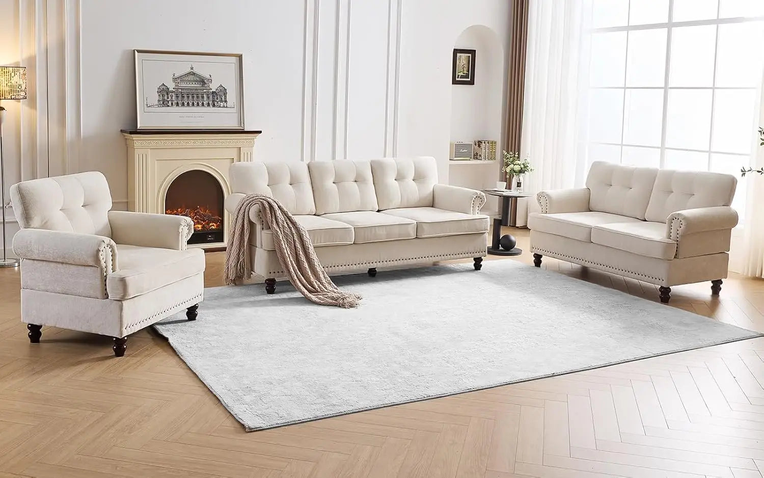 Tufted Sofa Set for Living Room with 3 Seater Couch Loveseat Sofa and Living Room Chairs in Beige with Rivets Rolled Arms and Solid Wood Legs
