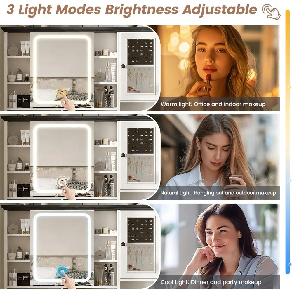 - Lighted Mirror: Enjoy flawless makeup application with a high-definition LED mirror featuring three adjustable color modes—natural, warm, and cool. Effortlessly switch between settings with a simple touch.